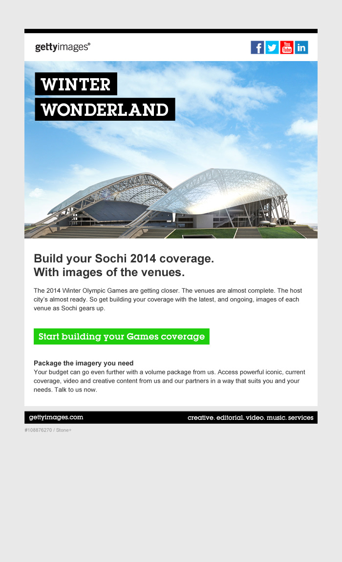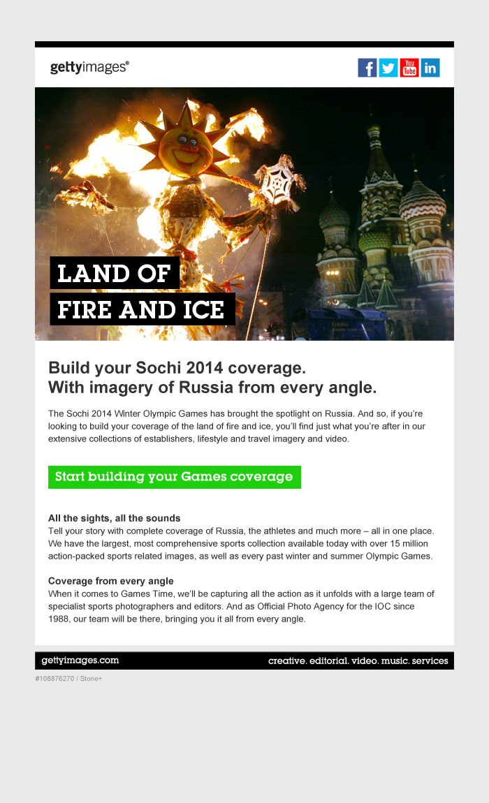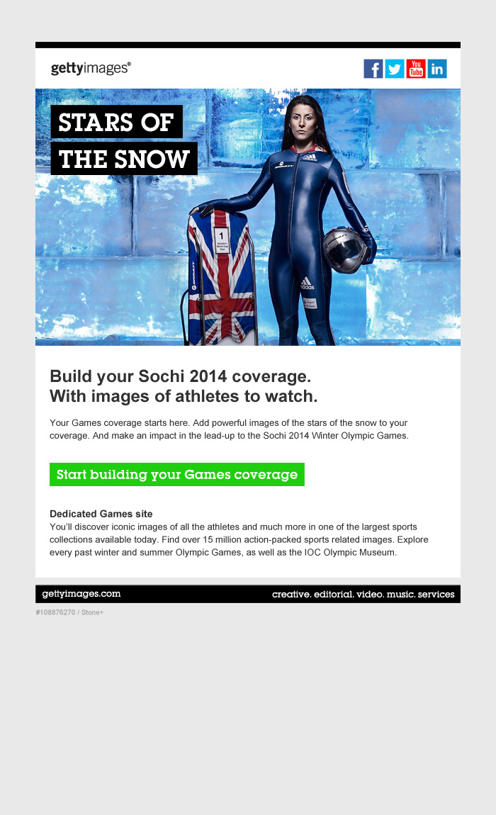 Agency: In House Client: Getty Images Role: Design and Art Direction Brief: This was an email campaign built on Eloqua templates, to promote media agencies being ready with content imagery for the upcoming Winter Olympics in Russia.