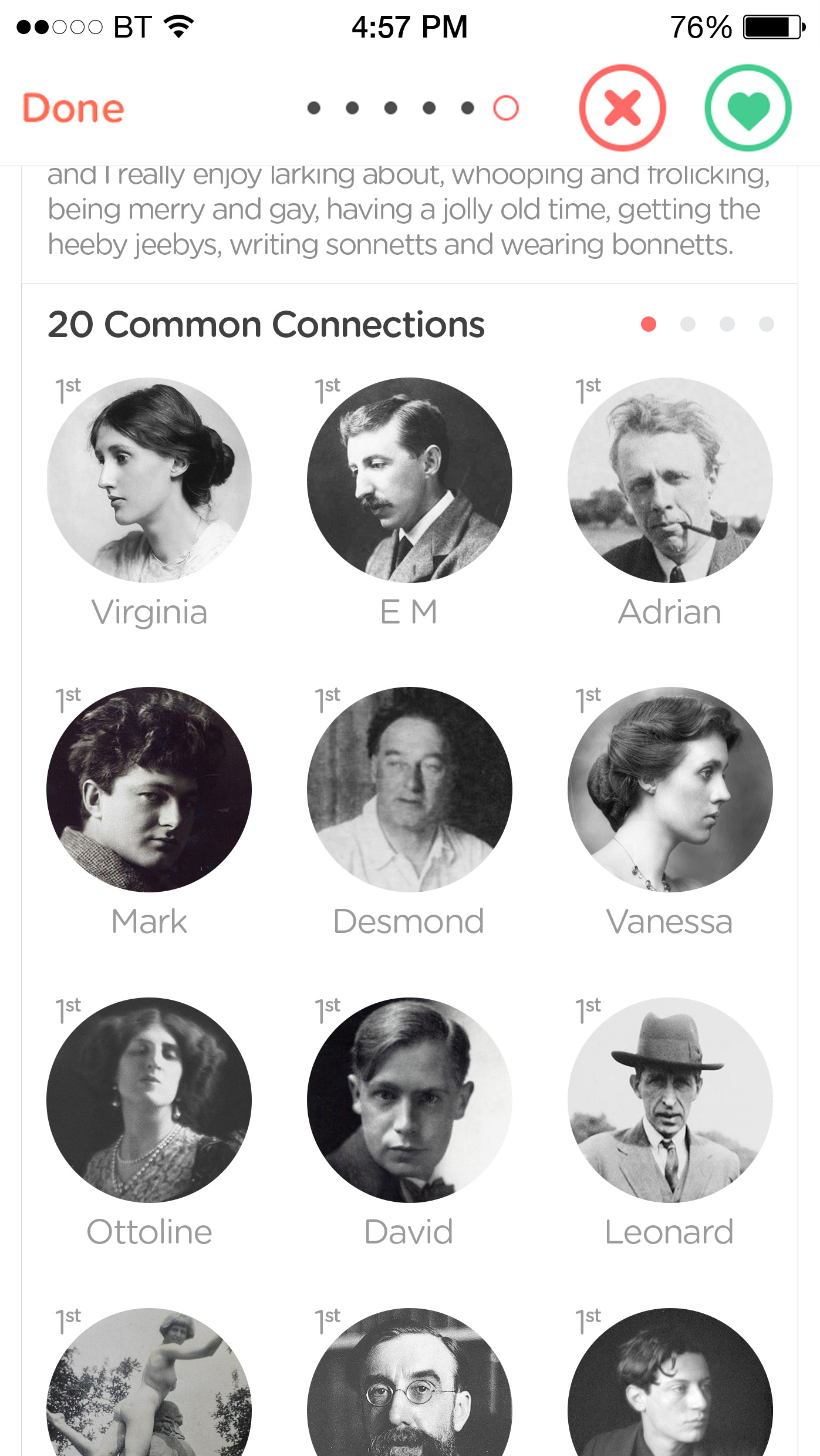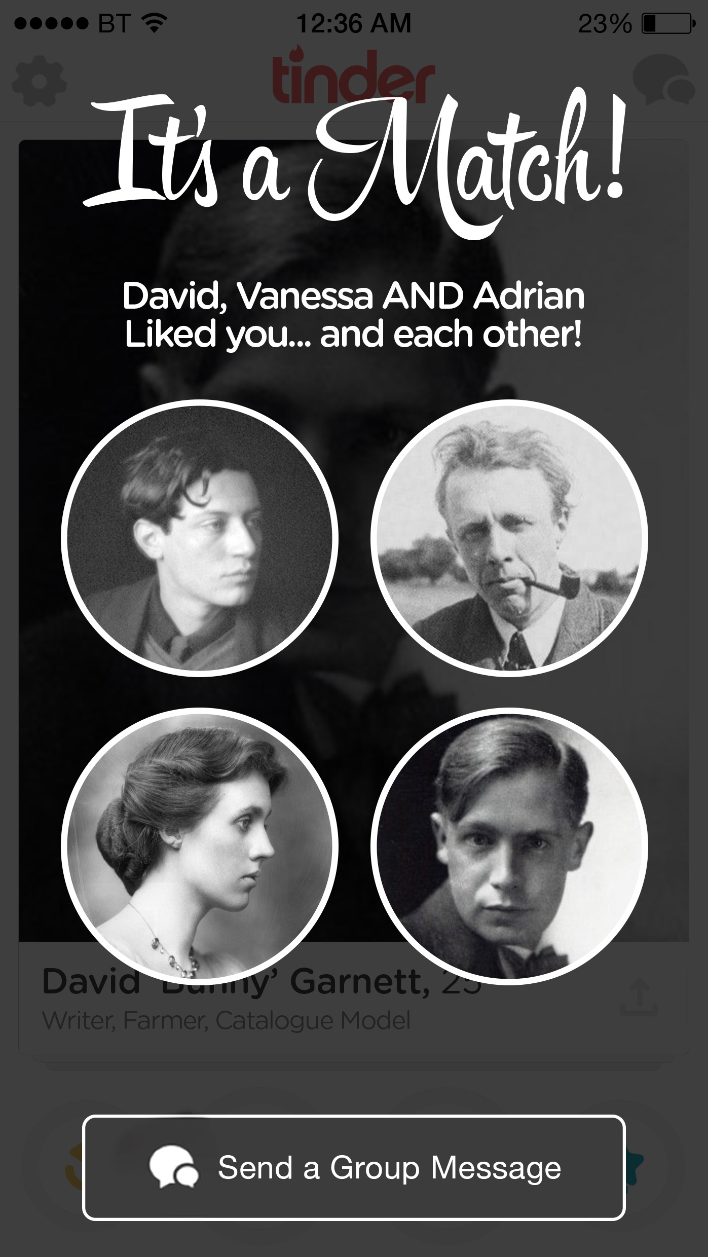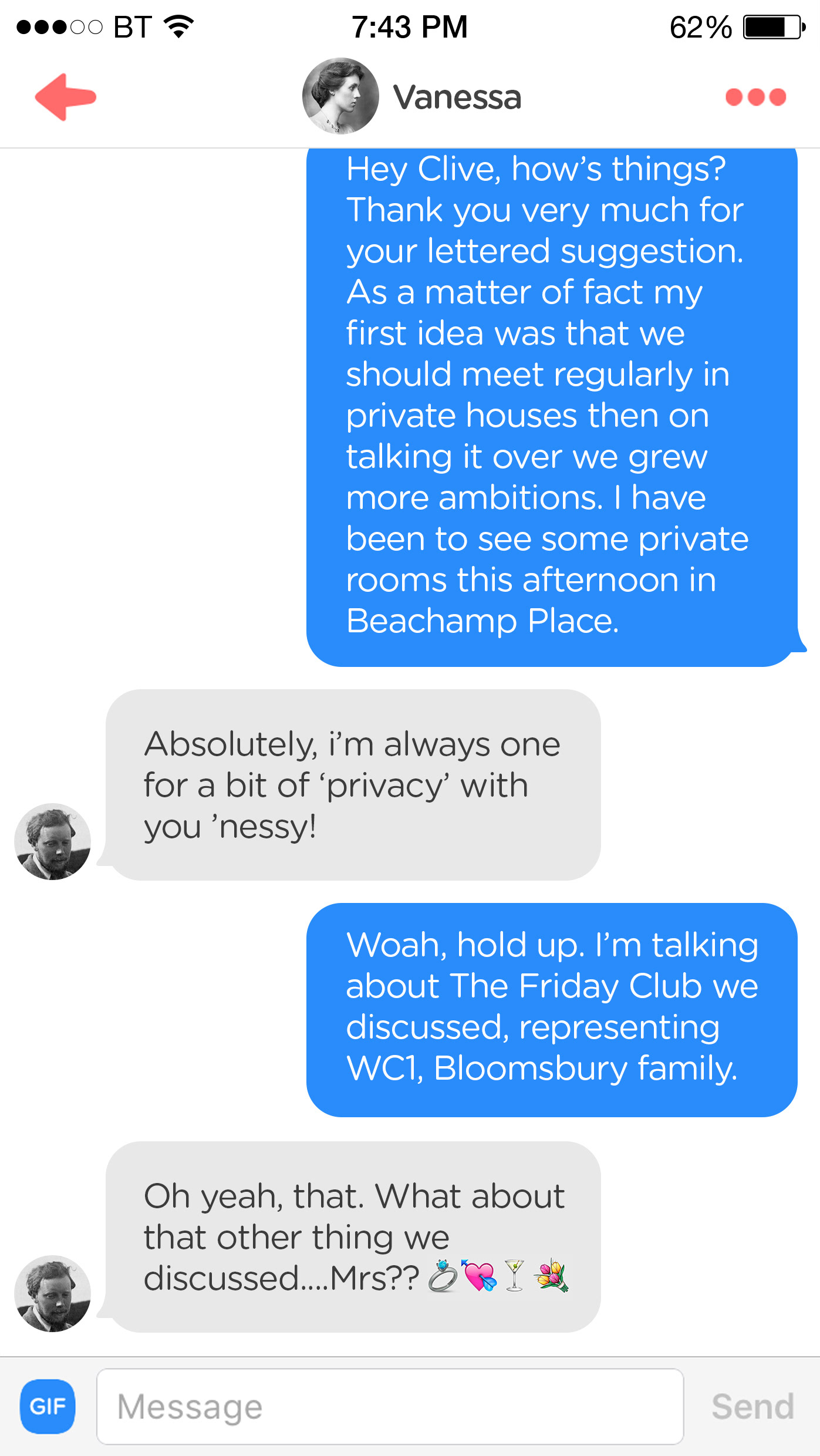 AGENCY: Acrylicize CLIENT: The Office Group ROLE: Design and Copyrighting BRIEF: Create a series of prints that demonstrate the complicated relationships of the Bloomsbury Group, using the modern dating language of Tinder.