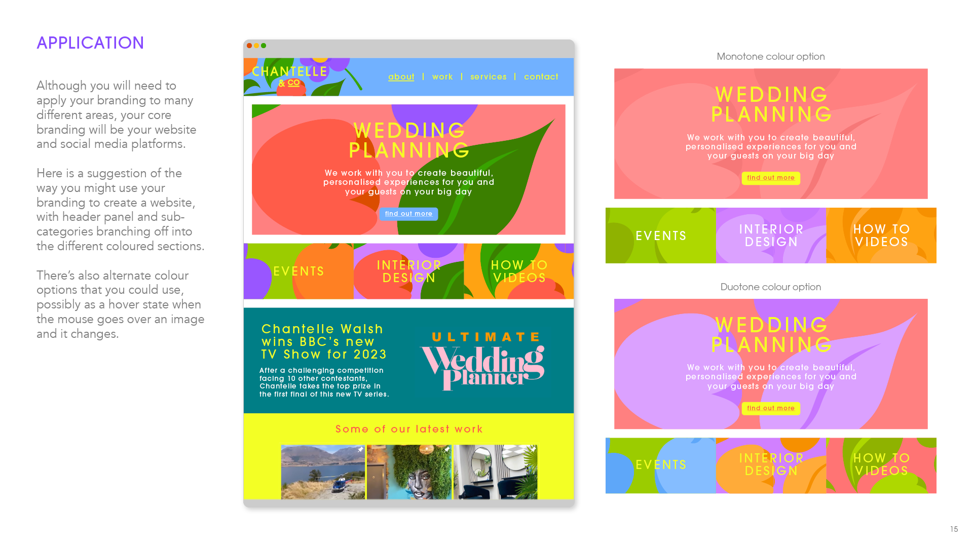 Agency: BBC Creative Studios Client: Chantelle & Co Role: Design and Art Direction Brief: I was commissioned by the BBC to create a branding package for the winner of their new TV show 'The Ultimate Wedding Planner.' This was part of their prize in the show, giving them a step up to help launch their new business venture in the world of Wedding Planning. I created an identity and complete branding package including all useable assets and Brand Guidelines to make it foolproof to use. The BBC were so happy with the results they invited me to present the work at their weekly creative department meeting.